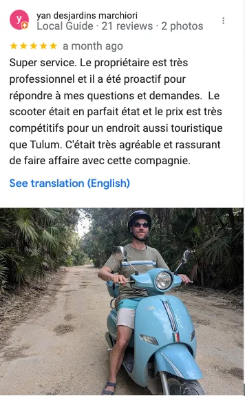 Yan DesjardinsSuper service. Le propriétaire est très professionnel et il a été proactif pour répondre à mes questions et demandes. Le scooter était en parfait état et le prix est très compétitifs pour un endroit aussi touristique que Tulum. C'était très agréable et rassurant de faire affaire avec cette compagnie.