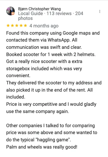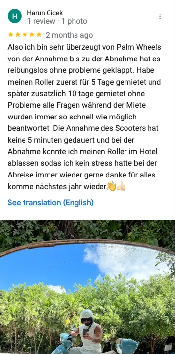 HarunAlso ich bin sehr überzeugt von Palm Wheels von der Annahme bis zu der Abnahme hat es reibungslos ohne probleme geklappt. Habe meinen Roller zuerst für 5 Tage gemietet und später zusatzlich 10 tage gemietet ohne Probleme alle Fragen während der Miete wurden immer so schnell wie möglich beantwortet. Die Annahme des Scooters hat keine 5 minuten gedauert und bei der Abnahme konnte ich meinen Roller im Hotel ablassen sodas ich kein stress hatte bei der Abreise immer wieder gerne danke für alles komme nächstes jahr wieder👋👍🏻