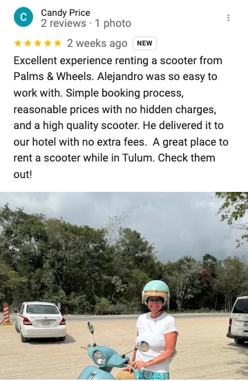 CandyExcellent experience renting a scooter from Palms & Wheels. Alejandro was so easy to work with. Simple booking process, reasonable prices with no hidden charges, and a high quality scooter. He delivered it to our hotel with no extra fees. A great place to rent a scooter while in Tulum. Check them out!