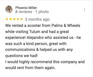 PhoenixWe rented a scooter from Palms & Wheels while visiting Tulum and had a great experience! Alejandro who assisted us - he was such a kind person, great with communications & helped us with any questions we had!