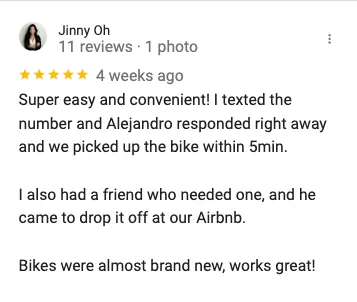 JinnySuper easy and convenient! I texted the number and Alejandro responded right away and we picked up the bike within 5min.